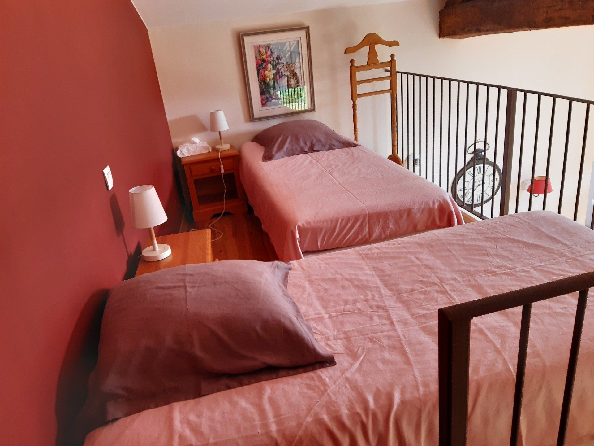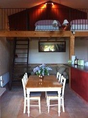 Vous disposez d'une chambre pour 2 personnes avec 1 lit de 140cm et une mezzanine dans la pièce principale avec 2 lits d'enfants.