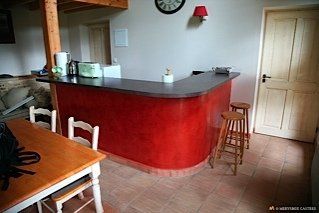 Ancienne buchère rénovée de 45m2, cette charmante petite maison vous accueille dans un séjour-cuisine équipée à la charpente apparente, murs en chaux et chanvre, sols en pierre et tomettes.